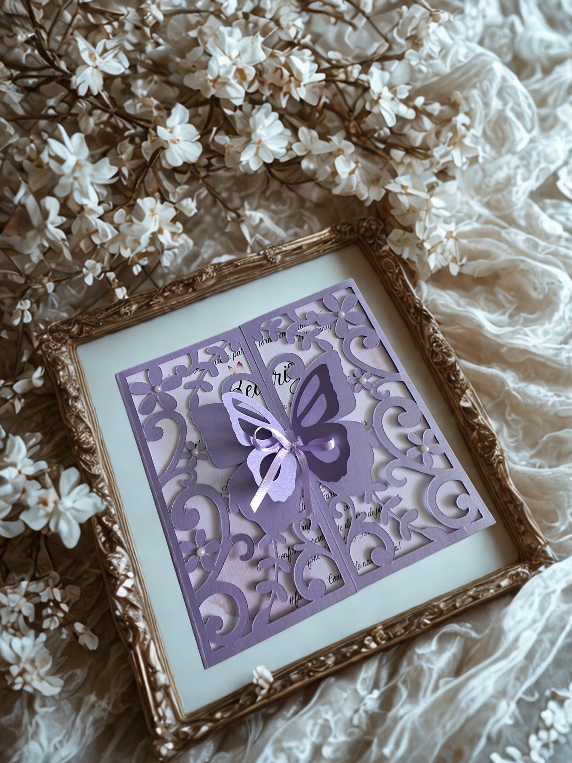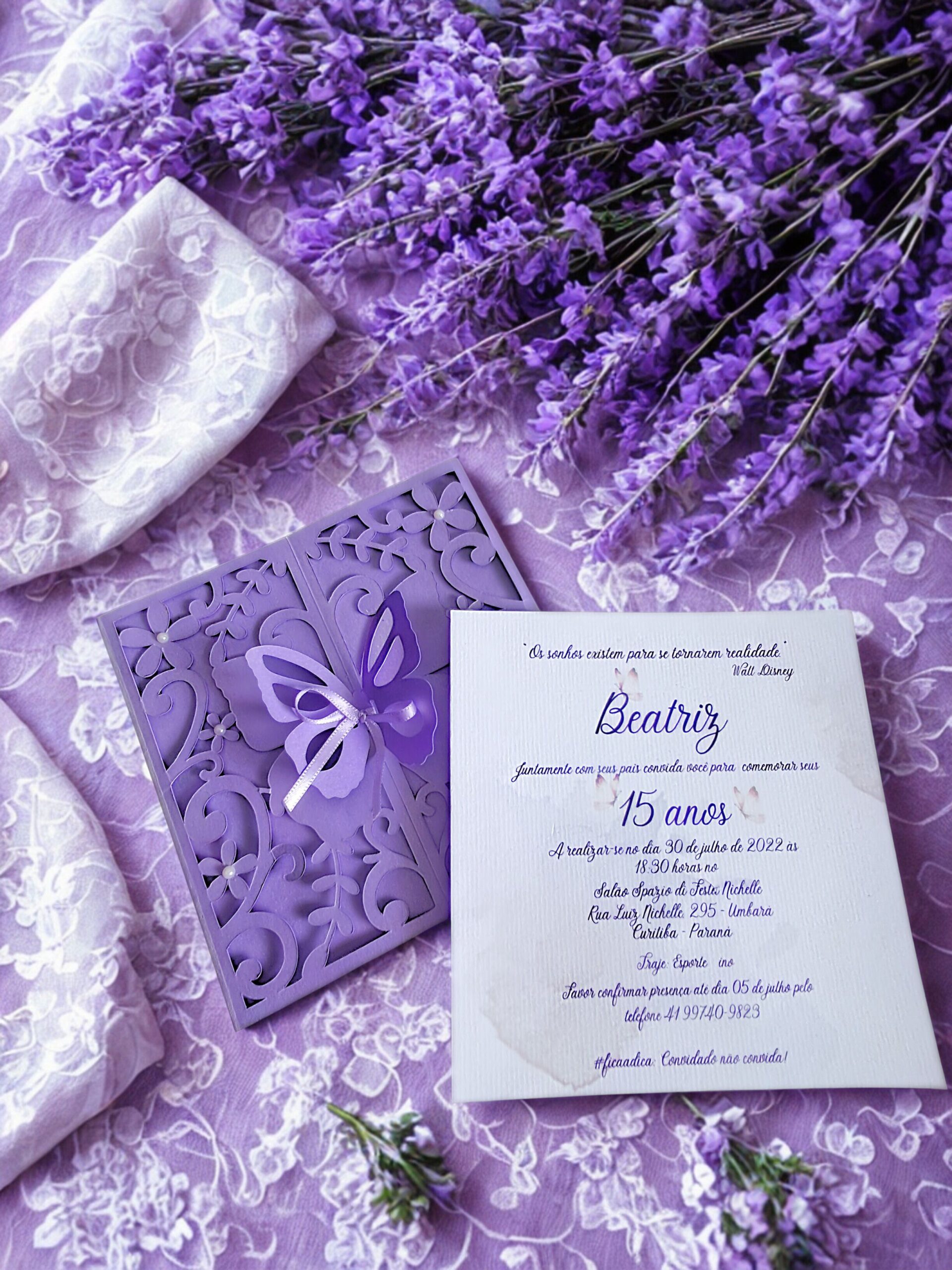 O convite de 15 anos Borboleta de Lavanda é uma verdadeira expressão de delicadeza e encanto. Produzido em papel Color Plus perolado, o modelo se destaca pelo envelope com recorte artesanal rendado, que revela uma borboleta central, símbolo de transformação e crescimento.