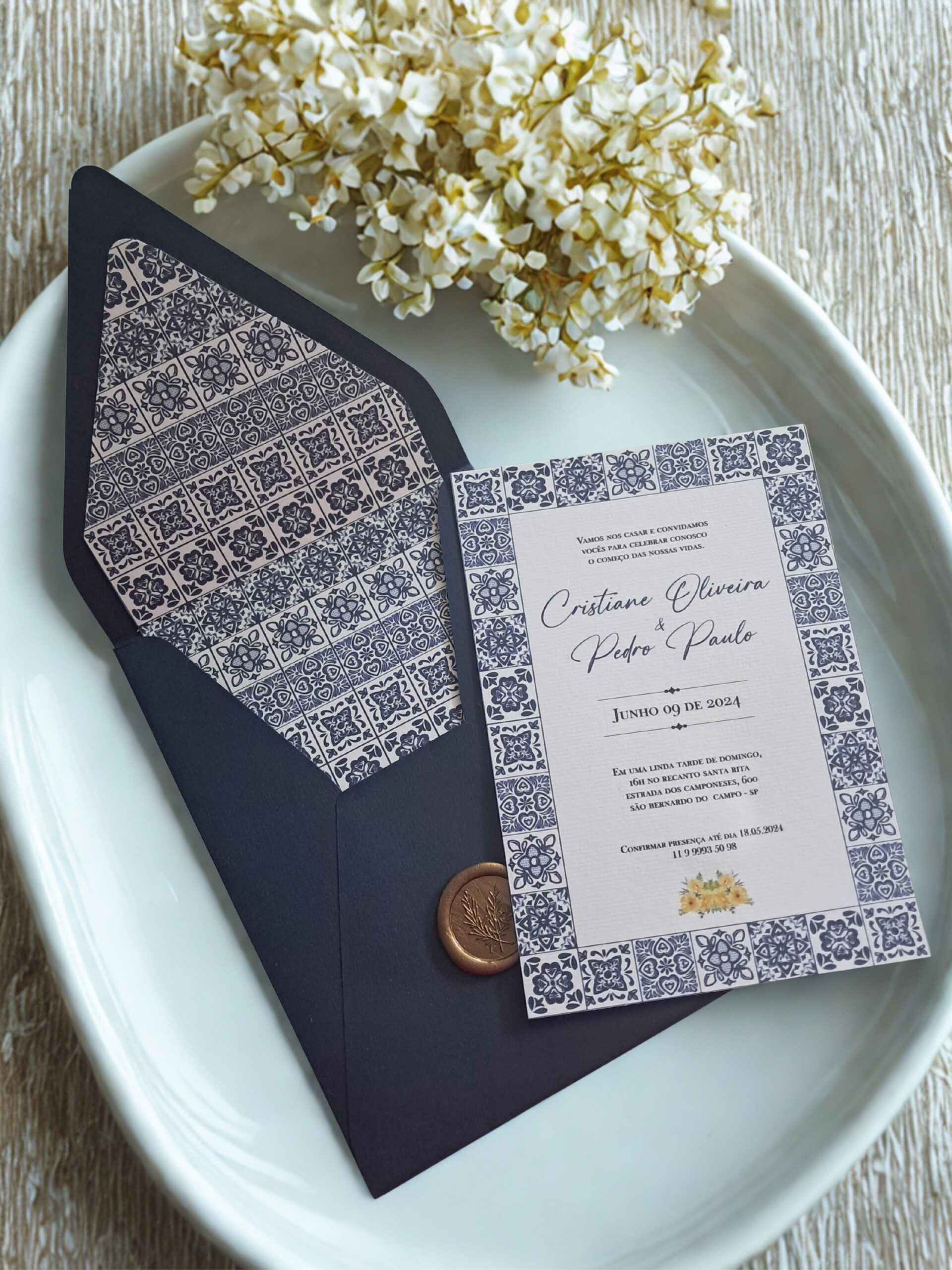 O convite é impresso em papel de alta qualidade, com moldura ornamental em padrão de azulejos azul e branco, trazendo charme, delicadeza e personalidade. O envelope em papel azul-marinho possui forro interno estampado, criando uma apresentação refinada e surpreendente desde o primeiro contato.