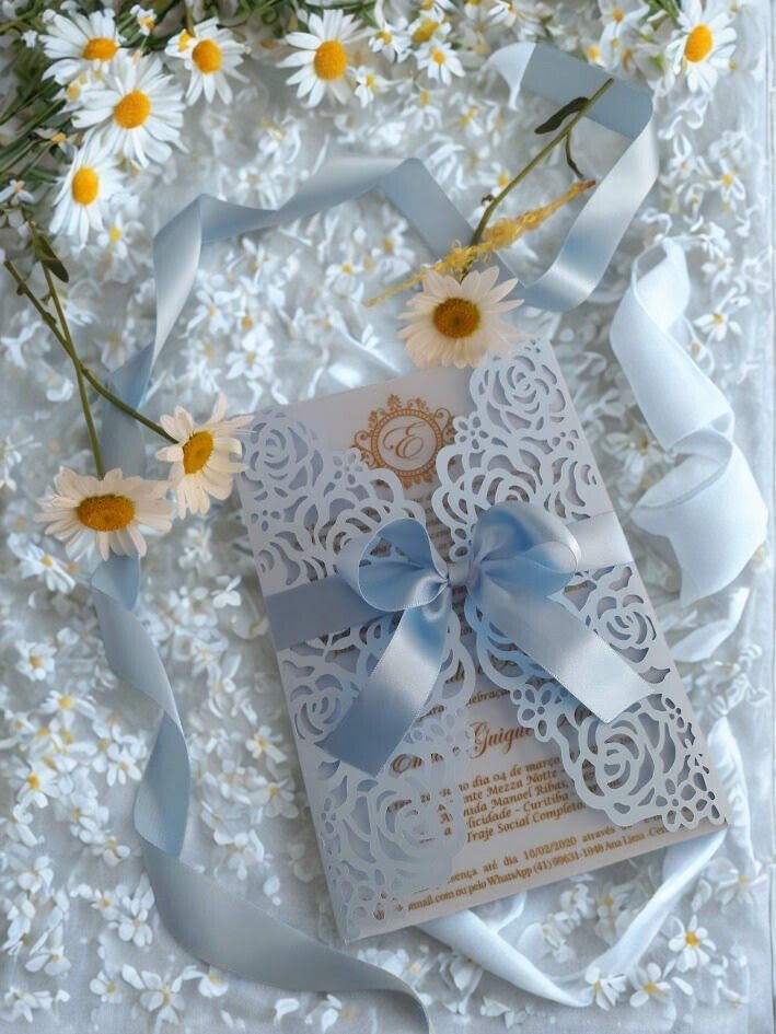 Convite em papel vegetal com envelope rendado artesanal em papel perolizado e acabamento em fita de cetim. Delicado, sofisticado e personalizável.